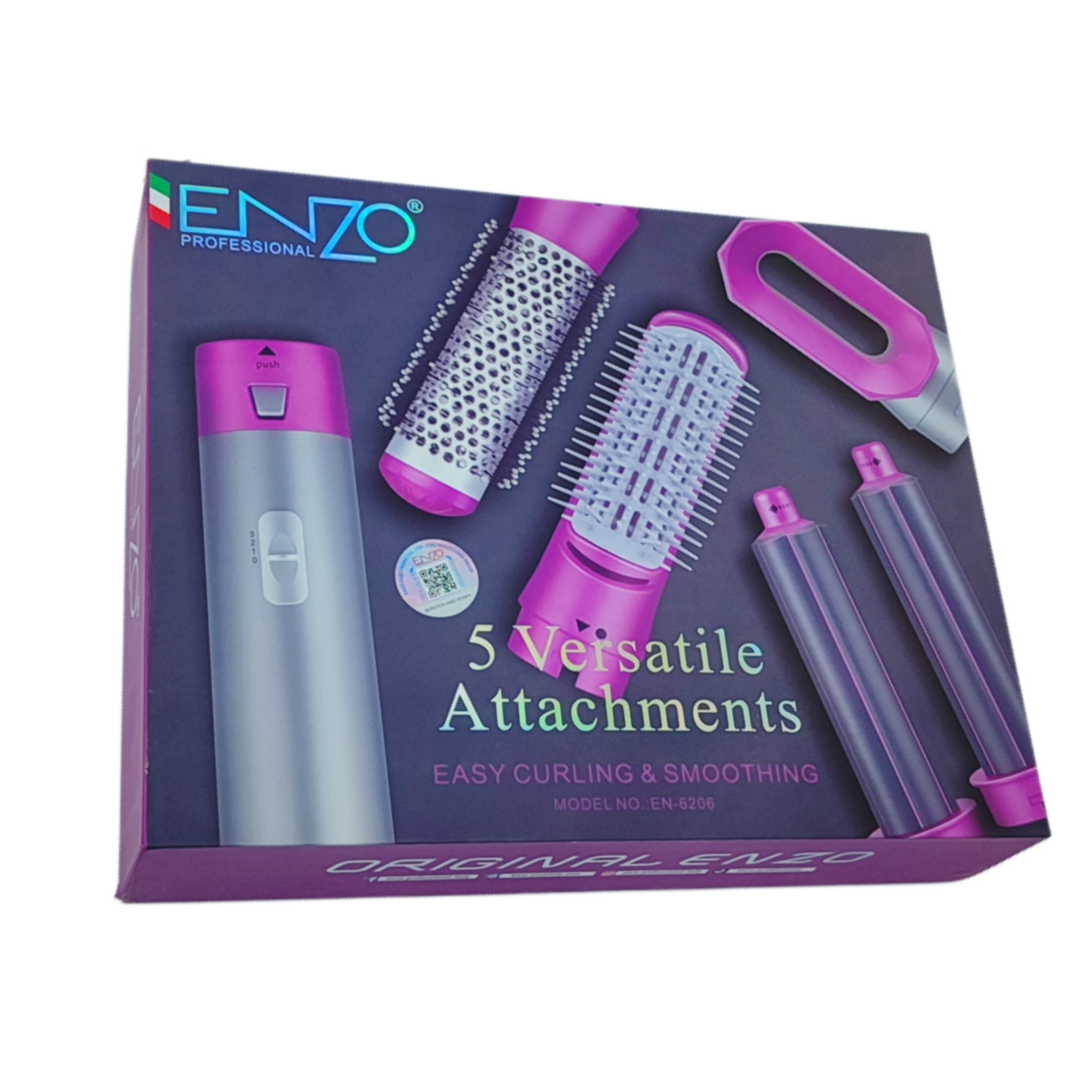سشوار برسدار پنجکاره Enzo EN-6206 یک مجموعه کامل برای صاف کردن، فر کردن، حجمدهی و موجدار کردن موها است. با توان واقعی ۱۰۰۰ وات و ۵ سری حرفهای، این دستگاه یکی از کاربردیترین ستهای حالتدهنده برای خانمهای شیکپوش است.