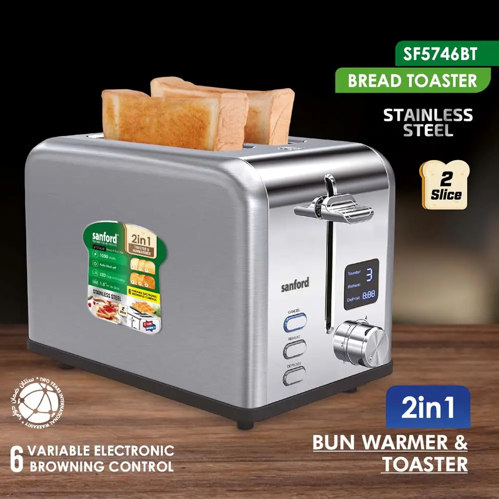این توستر از برند Sanford یک دستگاه دوکاره (توستر و گرمکن نان) با طراحی مدرن و بدنه استیل است که به دلیل توان ۱۰۵۰ واتی، سرعت عمل بالایی در برشته کردن دارد.