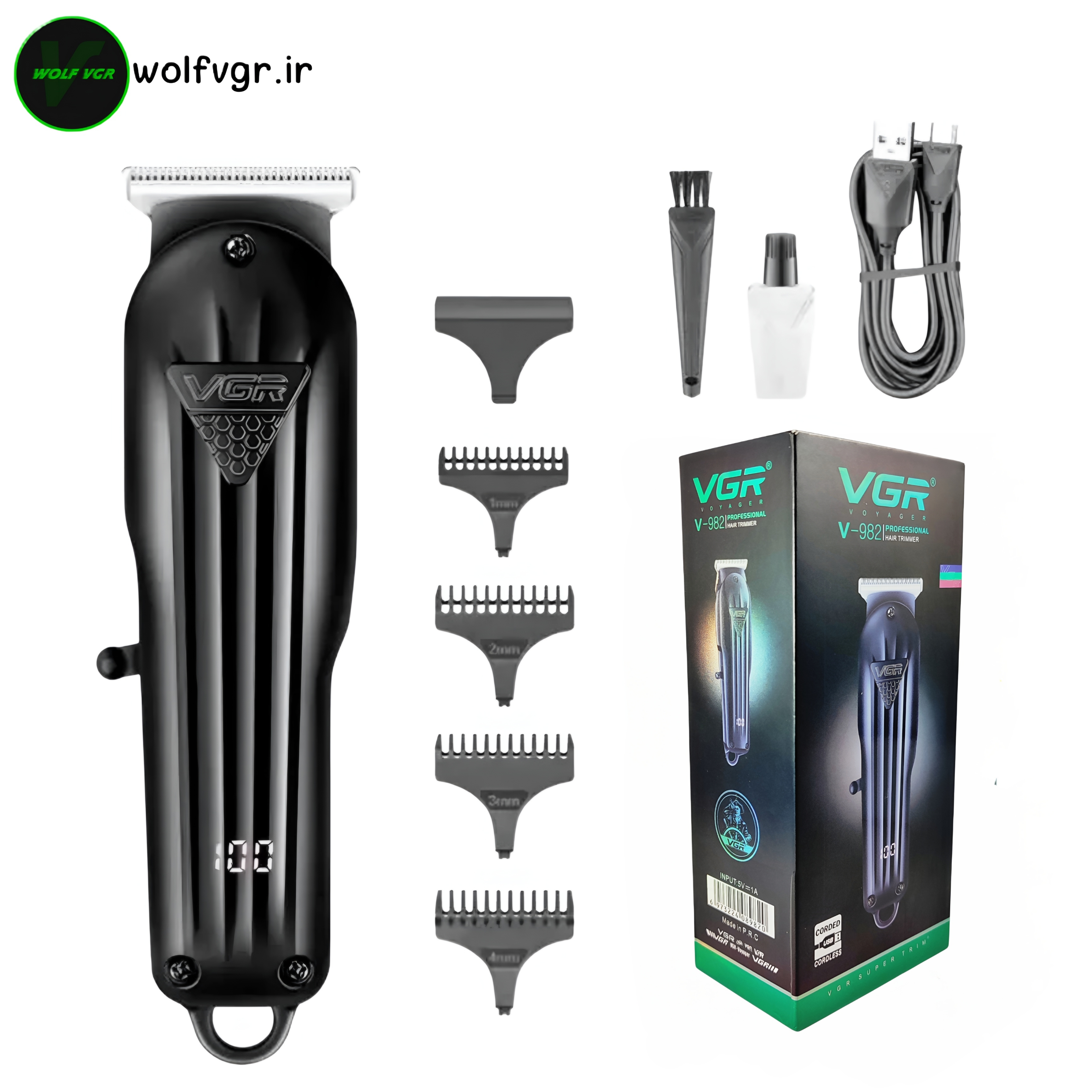 - اقلام همراه vgr 982 ۴ عدد شانه برای اصلاح صورت و سایه زنی،یک عدد کابل شارژ usb،یک عدد روغن و یک عدد برس تمیز کننده.